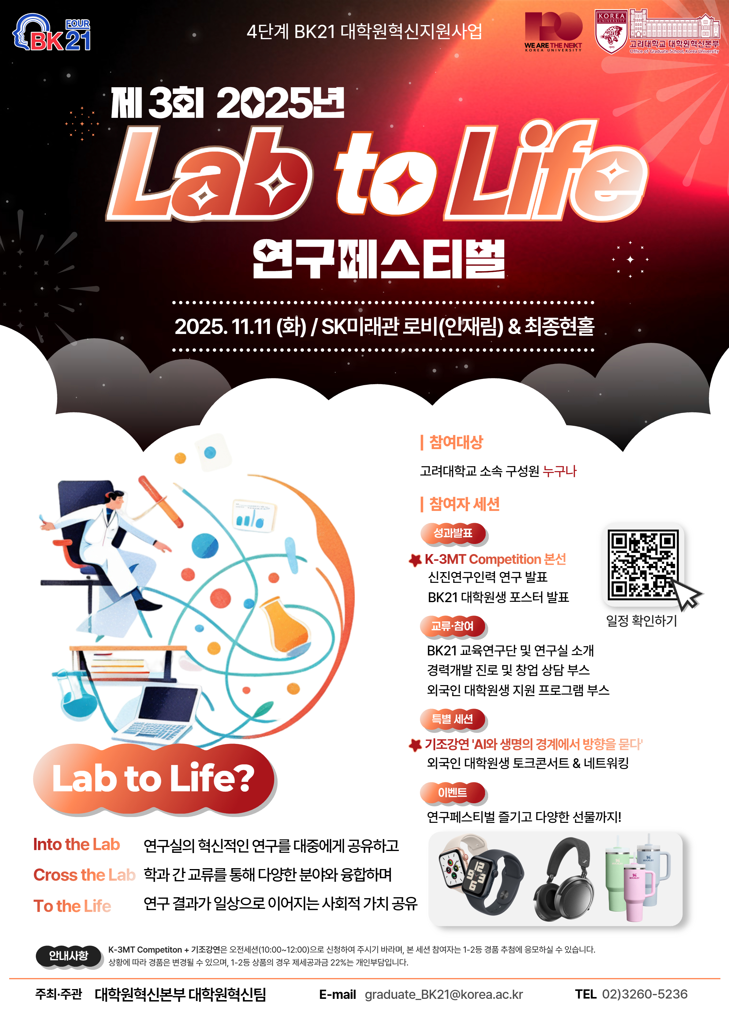 | 제목 | 제3회 2025년 Lab To Life 연구페스티벌 개최 안내 |